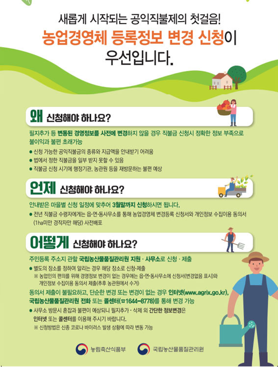 2020³â »õ·Ó°Ô ½ÃÀ۵Ǵ ¡®°øÀÍÁ÷ºÒÁ¦¡¯µµ ³ó¾÷°æ¿µÃ¼ µî·Ï Á¤º¸¸¦ ±âº»À¸·Î ¼³°èµÇ¾ú´Ù. ³ó¾÷ÀÎ Áؼö»çÇ× Áß ³ó¾÷°æ¿µÃ¼ µî·Ï ¹× º¯°æ½Å°í°¡ Á¶°ÇÀÎ °Íµµ ±× ÀÌÀ¯ÀÎ °ÍÀÌ´Ù. 0.5ha¹Ì¸¸ °æÀÛÇÏ´Â ³ó°¡¿¡°Ô ÁÖ¾îÁö´Â ¼Ò³óÁ÷ºÒ±Ý. Àç¹è¸éÀû¿¡ ´ëÇÑ ³óÁö Á¤º¸ ¿ª½Ã ³ó¾÷°æ¿µÃ¼ µî·Ï Á¤º¸ÀÌ´Ù. µû¶ó¼ Á÷ºÒ±ÝÀ» ½ÅûÇϰíÀÚ ÇÏ´Â ³ó¾÷ÀÎÀº 4¿ù 17ÀϱîÁö ³ó¾÷°æ¿µÃ¼ µî·Ï Á¤º¸¸¦ º¯°æÇØ¾ß ÇÑ´Ù.