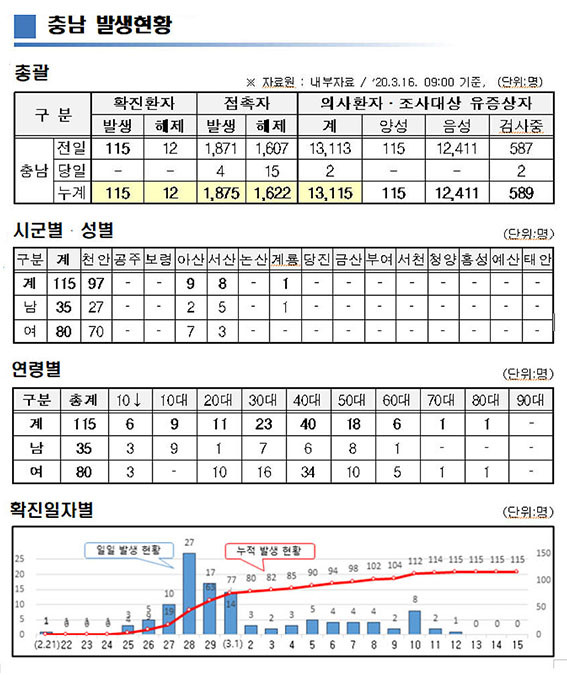 | | ¡è¡è <ÀÚ·á=Ãæ³²µµ¹æ¿ª´ëÃ¥º»ºÎ> | ¨Ï ¿Â¾ç½Å¹® | | ÇÑÆí 16ÀÏ ÇöÀç µµ³» È®ÁøÀÚ´Â 115¸íÀ¸·Î, Áö³ 13ÀϺÎÅÍ »çÈê °£ Ãß°¡ ¹ß»ýÀº ¾ø¾úÀ¸¸ç, 12¸íÀÌ Åð¿øÇß´Ù.