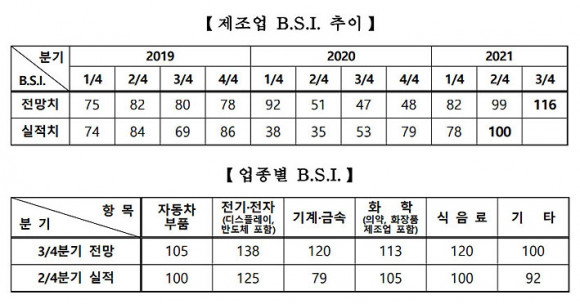 Ãæ³²ºÏºÎ»ó°øÈ¸ÀǼÒ(ȸÀå ¹®»óÀÎ)´Â °ü³»(õ¾È¡¤¾Æ»ê¡¤¿¹»ê¡¤ È«¼º) 102°³ Á¦Á¶¾÷ü¸¦ Ç¥º»À¸·Î 2021³â 3/4ºÐ±â Á¦Á¶¾÷ °æ±â½Ç»çÁö¼ö(BSI)¸¦ Á¶»çÇÑ °á°ú, 2021³â 3/4ºÐ±â Àü¸ÁÄ¡´Â Áö³ 2021³â 1ºÐ±â Àü¸Á ¡®99¡¯ ´ëºñ 17Æ÷ÀÎÆ® »ó½ÂÇÑ ¡®116¡¯ÀÇ Áö¼ö¸¦ ³ªÅ¸³Â´Ù. 2021³â 2/4ºÐ±â ½ÇÀûÄ¡´Â ¡®100¡¯À¸·Î ÀüºÐ±â ½ÇÀû ¡®78¡¯ ´ëºñ 22Æ÷ÀÎÆ® »ó½ÂÇÑ ¹Ù ÀÖ´Ù.