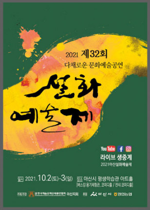 ÇÑÆí Á¦32ȸ ¼³È¿¹¼úÁ¦ °ø¿¬ ¹× Àü½Ã´Â À¯Æ©ºê(www.youtube.com) ä³Î(¾Æ»ê¿¹ÃÑ), ÆäÀ̽ººÏ(www.facebook.com) °Ë»öâ¿¡ ¡®2021 Á¦32ȸ ¾Æ»ê ¼³È¿¹¼úÁ¦¡¯¸¦ ÀÔ·ÂÇÏ¸é »ý¹æ¼ÛÀ¸·Î ½ÃûÇÒ ¼ö ÀÖ´Ù.