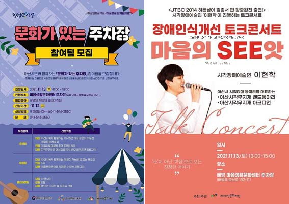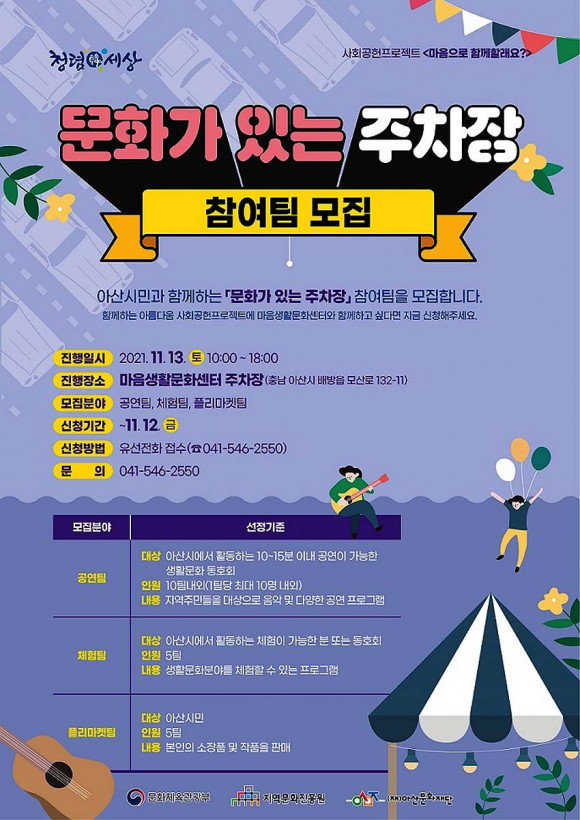 ¸¶À½»ýȰ¹®È¼¾ÅÍ ÁÖÂ÷Àå¿¡¼ ¿¸®´Â ÀÌ Çà»ç¿¡¼´Â ÇÔ²²ÇÒ °ø¿¬, üÇè, Çø®¸¶ÄÏÆÀÀ» ¸ðÁýÇϸç 11¿ù 12ÀÏ(±Ý)±îÁö À¯¼±(¢Ï041-541-2560)À» ÅëÇØ ½Åû °¡´ÉÇÏ´Ù.