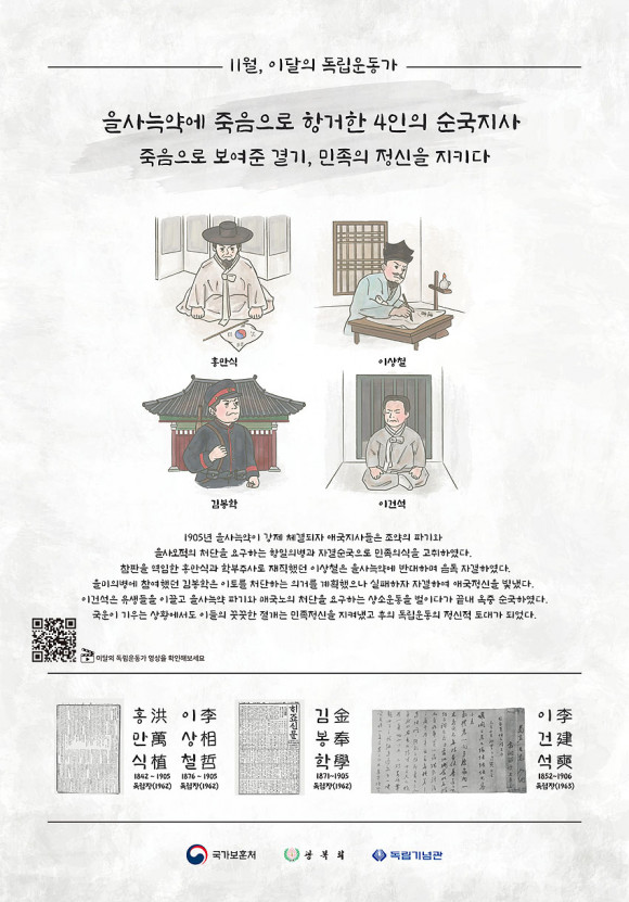 Ãæ³²¼ºÎº¸ÈÆÁöûÀº ±¹°¡º¸ÈÆÃ³¡¤±¤º¹È¸¡¤µ¶¸³±â³ä°üÀÌ °øµ¿À¸·Î ¼±Á¤ÇÑ 11¿ùÀÇ µ¶¸³¿îµ¿°¡ È«¸¸½Ä(1842~1905)¡¤ÀÌ»óö(1876~1905)¡¤±èºÀÇÐ(1871~1905)¡¤À̰Ǽ®(1852~1906) ¼±»ýÀ» ±¹¹Îµé¿¡°Ô ³Î¸® È«º¸Çϰí ÀÖ´Ù.