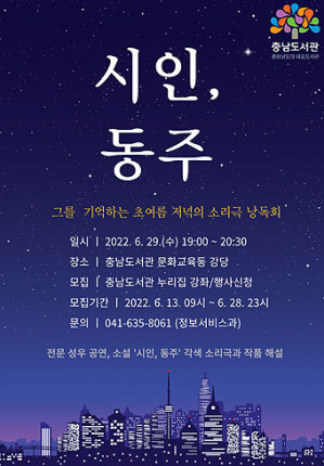 | | ¨Ï ¿Â¾ç½Å¹® | Ãæ³²µµ¼°üÀº 6¿ù È£±¹º¸ÈÆÀÇ ´ÞÀ» ¸Â¾Æ ¿À´Â 6¿ù 29ÀÏ µµ¼°ü ¹®È±³À°µ¿ °´ç¿¡¼ ÀúÇ×½ÃÀÎ À±µ¿ÁÖ¸¦ ±â³äÇÏ´Â ¡®½ÃÀÎ, µ¿ÁÖ¡¯ ¼Ò¸®±Ø ³¶µ¶È¸¸¦ °³ÃÖÇÑ´Ù°í 20ÀÏ ¹àÇû´Ù.