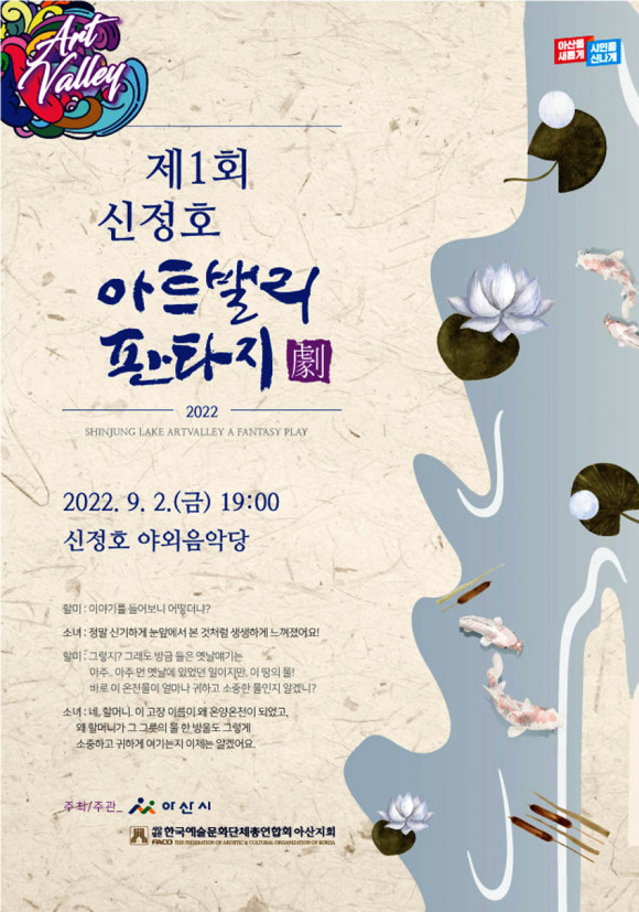 ¾Æ»ê½Ã(½ÃÀå ¹Ú°æ±Í) ÁÖÃÖ, (»ç)Çѱ¹¿¹¼ú¹®È´ÜüÃÑ¿¬ÇÕȸ ¾Æ»êÁöȸ(ÁöȸÀå À̵¿Çö¡¤¾Æ»ê¿¹ÃÑ) ÁÖ°üÀÇ ¡®2022³â Á¦1ȸ ½ÅÁ¤È£ ¾ÆÆ®¹ë¸® ÆÇŸÁö±Ø¡¯ °ø¿¬ÀÌ ¿À´Â 9¿ù 2ÀÏ ¿ÀÈÄ 7½Ã 30ºÐ ½ÅÁ¤È£ ¾ß¿ÜÀ½¾Ç´ç¿¡¼ °³ÃֵȴÙ.