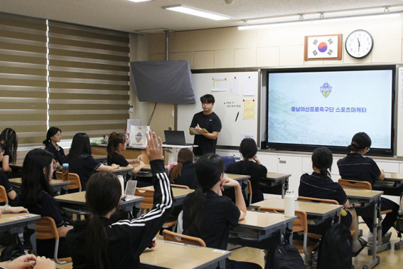 | | ¡è¡è <»çÁøÁ¦°ø=Ãæ³²¾Æ»êÇÁ·ÎÃ౸´Ù> | ¨Ï ¿Â¾ç½Å¹® | | Ãæ³²¾Æ»êÇÁ·ÎÃ౸´Ü(±¸´ÜÁÖ ¹Ú°æ±Í, ÀÌÇÏ Ãæ³²¾Æ»ê)ÀÌ Áö³ 8¿ù 24ÀÏ(¸ñ), ¾Æ»ê½Ã °ü³»¿¡ À§Ä¡ÇÑ ¿Â¾ç¿©ÀÚÁßÇб³(ÀÌÇÏ ¿Â¾ç¿©Áß)¸¦ ¹æ¹®ÇØ Ã»¼Ò³âÁø·Î¸àÅ丵 ¡®100ÀÎ 100»ö¡¯ ÇÁ·Î±×·¥À» ÁøÇàÇß´Ù.