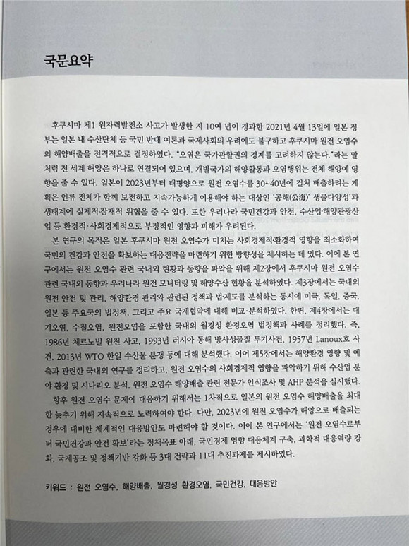 ÇØ´ç º¸°í¼ÀÇ Ã¹ ÆäÀÌÁöÀÎ ¡®±¹¹®¿ä¾à¡¯¿¡´Â ¡°¡®¿À¿°Àº ±¹°¡°üÇÒ±ÇÀÇ °æ°è¸¦ °í·ÁÇÏÁö ¾Ê´Â´Ù.¡¯¶ó´Â ¸»Ã³·³ Àü ¼¼°è ÇØ¾çÀº Çϳª·Î ¿¬°áµÅ ÀÖÀ¸¸ç, °³º°±¹°¡ÀÇ ÇØ¾çȰµ¿°ú ¿À¿°ÇàÀ§´Â Àüü ÇØ¾ç¿¡ ¿µÇâÀ» ÁÙ ¼ö ÀÖ´Ù. ÀϺ»ÀÌ 2023³âºÎÅÍ ÅÂÆò¾çÀ¸·Î ¿øÀü ¿À¿°¼ö¸¦ 30~40³â¿¡ °ÉÃÄ ¹èÃâÇÏ·Á´Â °èȹÀº Àηù Àüü°¡ ÇÔ²² º¸ÀüÇϰí Áö¼Ó°¡´ÉÇÏ°Ô ÀÌ¿ëÇØ¾ß ÇÏ´Â ´ë»óÀÎ ¡®°øÇØ(1%) »ý¹°´Ù¾ç¼º¡¯°ú »ýŰ迡 ½ÇÁ¦Àû¡¤ÀáÀçÀû À§ÇùÀ» ÁÙ ¼ö ÀÖ´Ù. ¶ÇÇÑ ¿ì¸®³ª¶ó ±¹¹Î°Ç°°ú ¾ÈÀü, ¼ö»ê¾÷ ÇØ¾ç°ü±¤»ê¾÷ µî ȯ°æÀû¡¤»çȸ°æÁ¦ÀûÀ¸·Î ºÎÁ¤ÀûÀÎ ¿µÇâ°ú ÇÇÇØ°¡ ¿ì·ÁµÈ´Ù¡±°í ¸í½ÃµÅ ÀÖ´Ù.