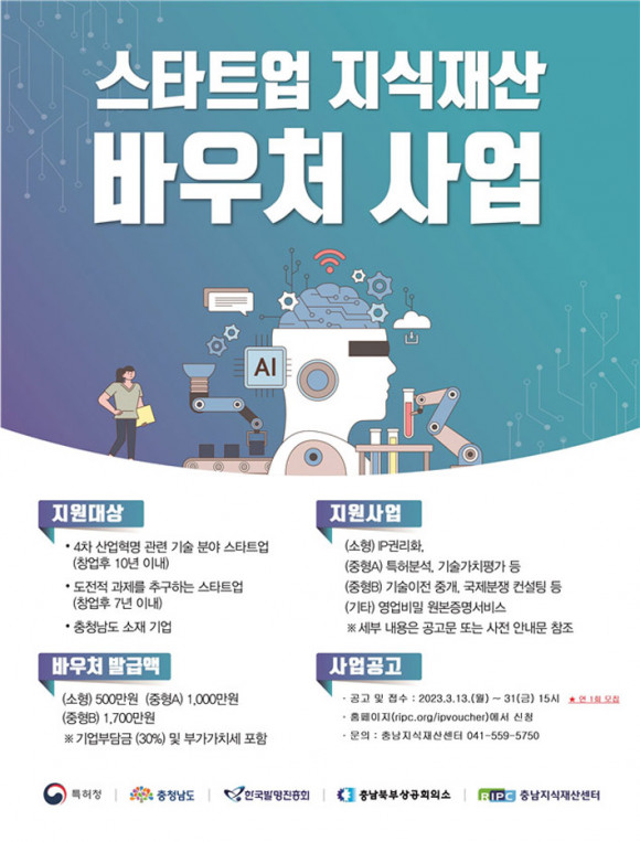 Ãæ³²ºÏºÎ»ó°øÈ¸ÀǼÒ(ȸÀå ¹®»óÀÎ) Ãæ³²Áö½ÄÀç»ê¼¾ÅÍ´Â 3¿ù 13ÀϺÎÅÍ 31ÀÏ ¿ÀÈÄ 3½Ã±îÁö ¡®Áö½ÄÀç»ê(IP) ¹Ù¿ìó »ç¾÷¡¯ÀÇ ´ë»ó±â¾÷À» ¸ðÁýÇÑ´Ù.