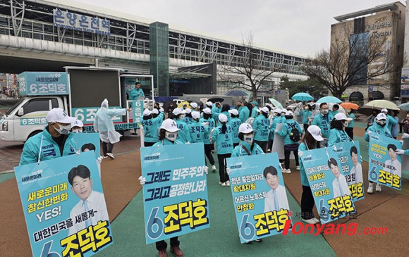 Á¦22´ë ±¹ÈñÀÇ¿ø¼±°Å ¾Æ»ê½Ã ¡®°©¡¯¼±°Å±¸¿¡ Ã⸶ÇÏ´Â »õ·Î¿î¹Ì·¡ Á¶´öÈ£ È帴 °ø½Ä ¼±°Å¿îµ¿ ù ³¯ÀÎ 28ÀÏ ¿ÀÀü ºñ°¡ ¿À´Â °¡¿îµ¥ ¿Â¾ç¿Âõ¿ª ±¤Àå¿¡¼ ÃâÁ¤½ÄÀ» °®°í ÁöÁö¸¦ È£¼ÒÇß´Ù.