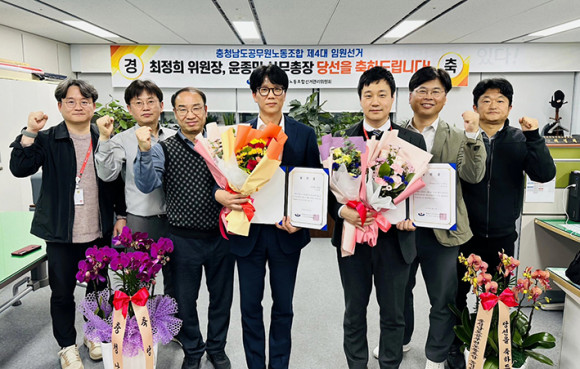 ÃæÃ»³²µµ°ø¹«¿ø³ëµ¿Á¶ÇÕ ¼±°Å°ü¸®À§¿øÈ¸(À§¿øÀå ÀÌÁÖÅÃ)´Â 4ÀÏ Ä¡·¯Áø Á¦4´ë ÀÓ¿ø¼±°Å¿¡ ´Üµ¶ Ã⸶ÇÑ ÃÖÁ¤Èñ(À§¿øÀå), À±Á¾¹Î(»ç¹«ÃÑÀå) È帰¡ Á¤Á¶ÇÕ¿ø 1,229¸í Áß 976¸í(79.4%)ÀÌ ÅõÇ¥¿¡ Âü¿©ÇØ 953Ç¥(97.6%)ÀÇ Âù¼ºÀ̶ó´Â ¾ÐµµÀû ÁöÁö·Î ´ç¼±µÆ´Ù.