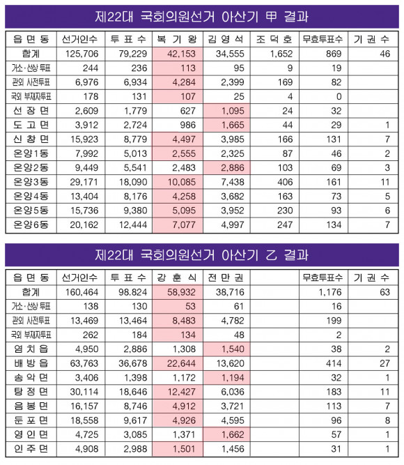 ´ÜÀ§¼±°Å±¸º° °³Ç¥ °á°ú º¹±â¿Õ È帴 »çÀüÅõÇ¥ µî°ú ½Åâ¸é, ¿Â¾ç1µ¿, ¿Â¾ç3~6µ¿ µî 7°³ Áö¿ª¿¡¼ ¿ìÀ§¸¦ º¸¿´´Ù. ƯÈ÷ º¹ È帴 °ü¿Ü »çÀüÅõÇ¥¿Í ÀÚ½ÅÀÇ °íÇâÀÎ ¿Â¾ç6µ¿¿¡¼ ūǥÂ÷ ¿ìÀ§¸¦ º¸ÀÌ¸ç ÆÇ¼¼¸¦ ±»Çû´Ù.