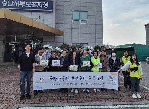 Ãæ³²¼ºÎº¸ÈÆÁöû ±¹°¡À¯°øÀÚ ¿ì¼±ÁÖÂ÷±¸¿ª ¼³Ä¡¸¦ ±â³äÇÏ¿© ¼Á¤¹Ì ÁöûÀå°ú È«¼º±ºÀÚ¿øºÀ»ç¼¾ÅÍ ¹æÀºÈñ ¼¾ÅÍÀå, û¿î´ëÇб³ °ø°£µðÀÚÀÎÇаú ¹ÚÇö¿Á ±³¼ö µîÀÌ Âü¼®ÇÑ °¡¿îµ¥ ¿ì¼±ÁÖÂ÷±¸¿ª ¾Õ¿¡¼ ±â³ä½ÄÀ» ¿¾ú´Ù.