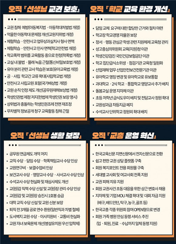 À̹ø ¼±°Å¿¡¼ ¡®¿ÀÁ÷ Çб³, ¿ÀÁ÷ ¼±»ý´Ô!¡¯À» ijġÇÁ·¹ÀÌÁî·Î ¡âüÇèÇнÀ¡¤¾ÈÀü»ç°í¡¤¾Æµ¿Çдë ÇÇ¼Ò ¸éÃ¥ º¸È£ ¡âºÒ¹ý¡¤¸ô·¡ ³ìÀ½ ±ÙÀý·Î ¼ö¾÷±Ç º¸È£ ¡â±³±Ç ÇÇÇØ Ä¡À¯ Áö¿ø ¡â°ø¹«¿ø¿¬±Ý °³¾Ç ÀúÁö ¡âÁ¤Ã¥¡¤Á¦µµ °³¼± û¿øÇ÷§Æû ±¸Ãà ¡â¼¼´ëº° ±³»çȸ ¹× ¿©±³»çȸ ÀüÆø Áö¿ø µîÀ» Çٽɰø¾àÀ¸·Î ³»°É¾ú´Ù.