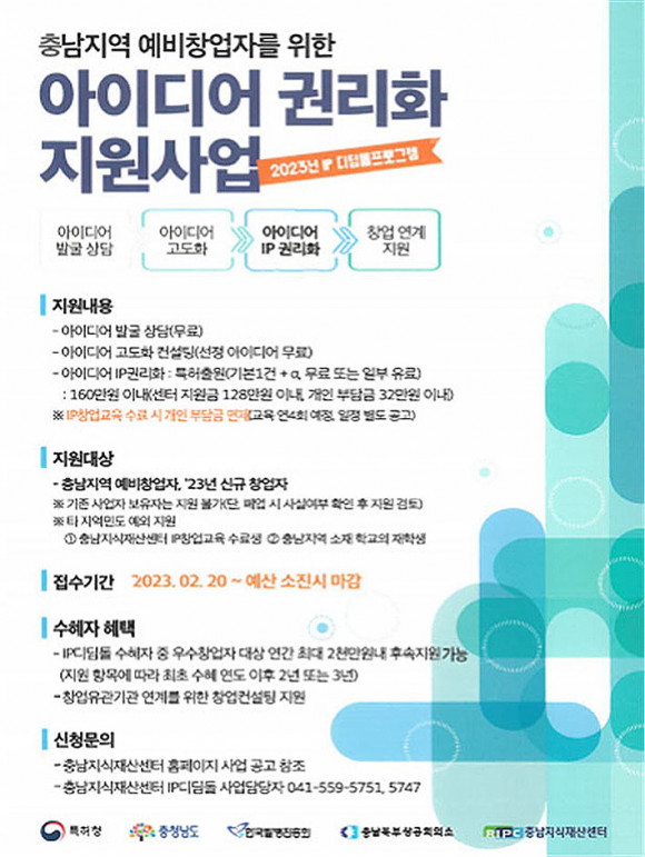 ¡®2023³â IPµðµõµ¹ ÇÁ·Î±×·¥ ¾ÆÀ̵ð¾î ±Ç¸®È »ç¾÷ÀÇ ½Åû ¹æ¹ý ¹× »ó¼¼³»¿ëÀº Ãæ³²Áö½ÄÀç»ê¼¾ÅÍ È¨ÆäÀÌÁö ¾Ë¸²¸¶´çÀÇ »ç¾÷°ø°í¿¡¼ ã¾Æº¼ ¼ö ÀÖ´Ù.
