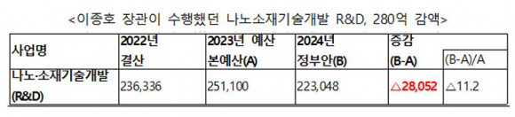 | | ¨Ï ¿Â¾ç½Å¹® | | ±×·±µ¥, ÀÌÁ¾È£ Àå°üÀÌ 7³â¿¡ °ÉÃÄ ¼öÇàÇÑ <³ª³ë¡¤¼ÒÀç±â¼ú°³¹ß(R&D)> »ç¾÷ÀÇ °æ¿ì 2022³â, 2023³â ¿¹»êÀÌ °è¼Ó Á¶±Ý¾¿ Áõ°¡ÇÏ´Ù°¡, 2024³â Á¤ºÎ¾È¿¡¼ óÀ½À¸·Î 280¾ï ¿ø Àü³â´ëºñ 11.2%¸¸Å »è°¨µÆ´Ù. 280¾ï ¿øÀ̸é ÀÌ Àå°üÀÌ ¸Å³â ¼öÇàÇß´ø Æò±Õ 4,6¾ï ¿ø ±Ô¸ð °úÁ¦µéÀ» 60°³ Á¤µµ ÇÒ ¼ö ÀÖ´Â ±Ô¸ð´Ù.