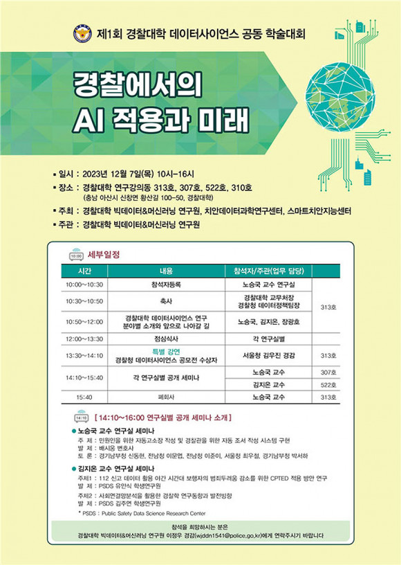 ÀÌ¾î¼ °æÂû´ëÇÐ ºòµ¥ÀÌÅÍ&¸Ó½Å·¯´×¿¬±¸¿ø, Ä¡¾Èµ¥ÀÌÅͰúÇבּ¸¼¾ÅͰ¡ °¢°¢ ÁÖ°üÇÏ´Â Çмú´ëȸ°¡ ¿·È´Ù. Çмú´ëȸ¿¡¼´Â ¹Î¿øÀÎÀ» À§ÇÑ ÀÚµ¿ °í¼ÒÀå ÀÛ¼º ½Ã½ºÅÛ, 112½Å°í µ¥ÀÌÅ͸¦ Ȱ¿ëÇÑ ¾ß°£ ½Ã°£´ë ȯ°æ¼³°è¸¦ ÅëÇÑ ¹üÁË¿¹¹æ(CPTED) Àû¿ë ¹æ¾È, »çȸ¿¬°á¸Á ºÐ¼®À» Ȱ¿ëÇÑ °æÂûÇÐ ¿¬±¸ Ãß¼¼ µî ´Ù¾çÇÑ ÁÖÁ¦°¡ ´Ù·ç¾îÁ³´Ù.