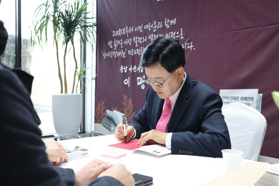 À̸í¼ö ÀÇ¿øÀº Ã¥ ¼¹®¿¡ ¡°2008³âºÎÅÍ ½Ã¹Î ¿©·¯ºÐ°ú ÇÔ²² ¶¡Èê·Á¿Â ¾Æ»ê ¹ßÀüÀÇ ¿Á¤°ú ºñÀüÀ¸·Î ¡®½Å¾Æ»ê°æÁ¦±Ç¡¯ ¹Ì·¡Àü·«! ²À ÀÌ·ï³»°Ú½À´Ï´Ù¡±¶ó°í ½èµíÀÌ ¡°Ã¥À» ¾²´Â °úÁ¤¿¡¼ ¾ÕÀ¸·Î ³»°¡ ¾Æ»ê½Ã¹Î°ú ¾Æ»ê¹ßÀüÀ» À§ÇØ ¾î¶°ÇÑ ¿ªÇÒÀ» ÇØ³ª°¡¾ß ÇÒÁö¿¡ ´ëÇÑ °íÂû°ú °¢¿À¸¦ ´Ù½Ã±Ý ´ÙÁüÇÑ´Ù¡±°í À̹ø ÃâÆÇ±â³äȸÀÇ ¼Òȸ¸¦ ¹àÇû´Ù.