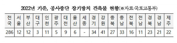 2022³â ±âÁØ °ø»çÁß´Ü Àå±â¹æÄ¡°ÇÃ๰Àº Àü±¹ 286°÷¿¡ ´ÞÇÑ´Ù. ±¤¿ªÁö¿ªº°·Î´Â °¿ø 41°÷, °æ±â 34°÷, Ãæ³² 33°÷, ÃæºÏ 27°÷, °æºÏ 23°÷ µîÀ» ³ªÅ¸³Â´Ù. ¿ëµµº°·Î º¸¸é, Àü±¹ ¹æÄ¡°ÇÃ๰ 286°÷ Áß °øµ¿ÁÖÅà 88°÷, ´Üµ¶ÁÖÅà 28°÷À¸·Î ÁÖÅÃÀÌ 116°÷(40.6%)¿¡ ´ÞÇß´Ù.