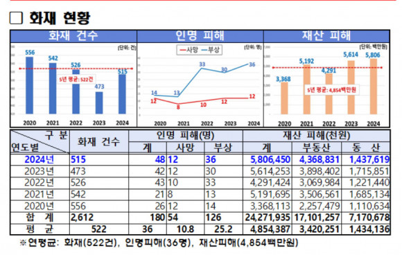 ÁÖÅà ÈÀç¿¡ µû¸¥ »ç»óÀÚ´Â ÃÑ 180¸íÀ¸·Î 2020³â 26¸í, 2021³â 21¸í, 2022³â 43¸í, 2023³â 42¸í, Áö³ÇØ 48¸íÀ¸·Î Áõ°¡Çß´Ù.