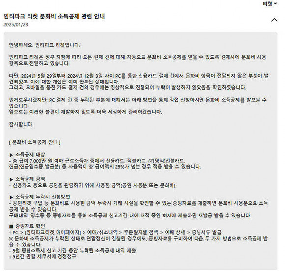 2024³â 5¿ù 29ÀϺÎÅÍ 12¿ù 3ÀϱîÁö ÀÎÅÍÆÄÅ© ƼÄÏ »çÀÌÆ®¿¡¼ PC¸¦ ÅëÇØ ½Å¿ëÄ«µå·Î °áÁ¦ÇÑ ³»¿ª Áß ÀϺΰ¡ ½Ã½ºÅÛ ¿À·ù·Î ¹®Èºñ°¡ ¾Æ´Ñ ÀÏ¹Ý °áÁ¦·Î ó¸®µÈ °ÍÀÌ´Ù.