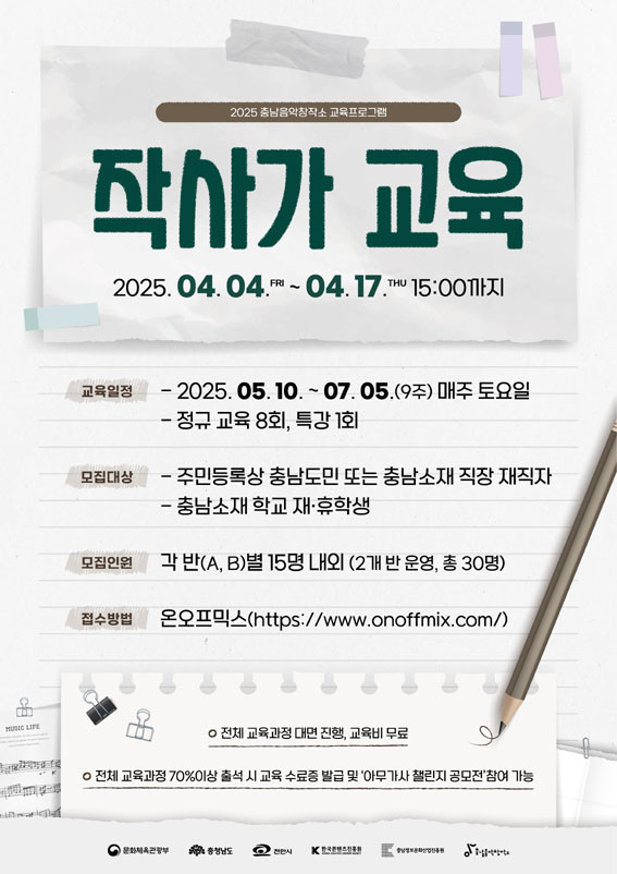 Ãæ³²Á¤º¸¹®È»ê¾÷ÁøÈï¿ø(¿øÀå ±è°î¹Ì)Àº Áö¿ª ´ëÁßÀ½¾Ç»ê¾÷ Ȱ¼ºÈ¸¦ ¸ñÀûÀ¸·Î ¡®2025³âµµ Àۻ簡 ±³À° ÇÁ·Î±×·¥¡¯ÀÇ ±³À°»ýÀ» 4¿ù 7ÀϺÎÅÍ ¸ðÁýÇÑ´Ù°í ¹àÇû´Ù.
