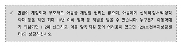 ³Ý°, ºÎ¸ð ±³À° ÇÁ·Î±×·¥°ú °¡Á¤ ³» Æø·Â ¿¹¹æ ±³À°À» ÅëÇØ, °¡Á¤ ³» ¹®Á¦¸¦ Á¶±â¿¡ ¹ß°ßÇÏ°í ¿¹¹æÇÏ´Â °ÍÀÌ ÇÊ¿äÇÏ´Ù. ƯÈ÷ 2021³â 1¿ù ¹Î¹ý»ó ¡°è±Ç Á¶Ç×ÀÌ ÆóÁöµÈ °ÍÀ» °è±â·Î ¾Æµ¿¿¡ ´ëÇÑ Ã¼¹ú ±ÝÁö ÀνÄÀ» È®»êÇϰí, ºÎ¸ðµéÀÌ ¾Æµ¿À» Á¸ÁßÇÏ´Â °¡¿îµ¥ ±àÁ¤ÀûÀ¸·Î ¾çÀ°ÇÒ ¼ö ÀÖµµ·Ï µ½´Â ´ë±¹¹Î Ä·ÆäÀÎÀ» Àü°³Çϰí, ¡®±àÁ¤ ¾çÀ° °¡À̵å¶óÀΡ¯À» Á¦ÀÛÇÏ¿© Àû±Ø ¾È³»Çϰí ÀÖ´Ù.