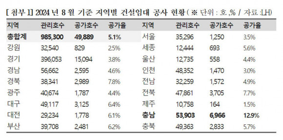 Áö¿ªÀûÀ¸·Î º¼ ¶§, ÀÓ´ëÁÖÅà °ø°¡À²Àº Ãæ³² 12.9%, °æºÏ 7.8%, ÀüºÏ 7.7%, ´ë±¸ 6.4%, ºÎ»ê 6.2%, ´ëÀü 6.1%, ÃæºÏ 5.7%, ¼¼Á¾ 5.6% µîÀ¸·Î ºñ¼öµµ±Ç Áö¿ªÀÇ °ø½ÇÀÌ ¸¹¾Ò´Ù.