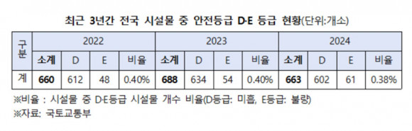 Áö³ 9¿ù 29ÀÏ ±¹È¸ ±¹Åä±³ÅëÀ§¿øÈ¸ ¼Ò¼Ó º¹±â¿Õ ´õºÒ¾î¹ÎÁÖ´ç ±¹È¸ÀÇ¿ø(¾Æ»ê½Ã°©)ÀÌ ±¹Åä¾ÈÀü°ü¸®¿ø¿¡¼ Á¦Ãâ¹ÞÀº ¡®½Ã¼³¹° ¾ÈÀüµî±Þ D/E µî±Þ ÇöȲ¡¯ ÀÚ·á¿¡ µû¸£¸é, Àü±¹ ½Ã¼³¹° Áß ¾ÈÀüµî±Þ ¹ÌÈí(Dµî±Þ) ¶Ç´Â ºÒ·®(Eµî±Þ) ÆÇÁ¤À» ¹ÞÀº ½Ã¼³¹° °³¼ö°¡ 2022³â 660°³, 2023³â 688°³, 2024³â 663°³ÀÎ °ÍÀ¸·Î ³ªÅ¸³µ´Ù.