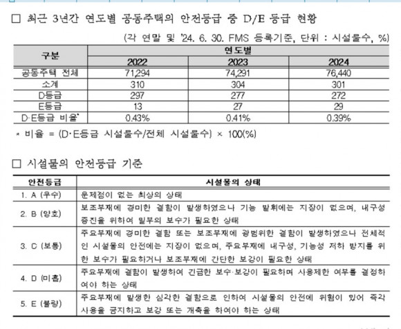 »ç¶÷ÀÌ °ÅÁÖÇÏ´Â °øµ¿ÁÖÅà Áß D¡¤Eµî±Þµµ 2022³â 310°³(Àüü °øµ¿ÁÖÅà ´ëºñ 0.43%), 2023³â 304°³(0.41%), 2024³â 301°³(0.39%)¿´´Ù. D¡¤Eµî±ÞÀ» ¹ÞÀº °øµ¿ÁÖÅÃÀÇ ¼ýÀÚ¿Í ºñÀ²Àº Á¶±Ý¾¿ °¨¼ÒÇϰí ÀÖÁö¸¸, ¿©ÀüÈ÷ 300°³µ¿ÀÌ ³Ñ´Â ¾ÆÆÄÆ®°¡ ¾ÈÀüÇÏÁö ¾Ê´Ù´Â °ÍÀÌ´Ù.