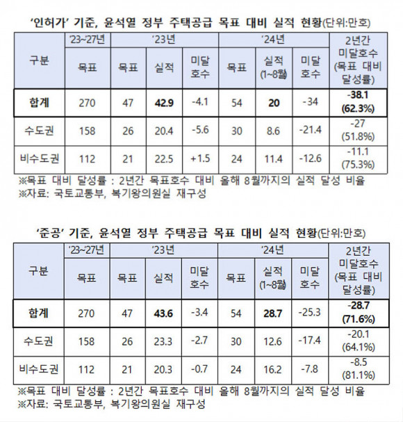 4ÀÏ ±¹È¸ ±¹Åä±³ÅëÀ§¿øÈ¸ ¼Ò¼Ó º¹±â¿Õ ´õºÒ¾î¹ÎÁÖ´ç ±¹È¸ÀÇ¿ø(¾Æ»ê½Ã°©)ÀÌ ±¹Åä±³ÅëºÎ¿¡¼ Á¦Ãâ¹ÞÀº ¡®À±¼®¿ Á¤ºÎ ÁÖÅðø±Þ ¸ñÇ¥ ¹× ½ÇÀû ÇöȲ¡¯ ÀÚ·á¿¡ µû¸£¸é, 2023³â°ú 2024³â ÁÖÅðø±Þ ¸ñÇ¥ 101¸¸ È£ Áß Áö³ÇغÎÅÍ ¿ÃÇØ 8¿ù±îÁö ÀÎÇã°¡ ½ÇÀûÀº 62¸¸ 9õ È£·Î, 38¸¸ 1õ È£°¡ ¹Ì´Þ¼ºµÆ´Ù.