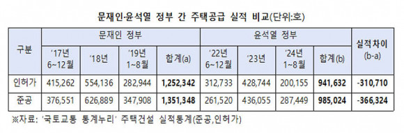 º¹±â¿Õ ÀÇ¿ø½ÇÀÌ ¡®±¹Åä±³Åë Åë°è´©¸®¡¯ Åë°èÀڷḦ ºÐ¼®ÇÑ °á°ú, ÁÖÅà ÀÎÇã°¡ °Ç¼ö°¡ 2017³â 6¿ùºÎÅÍ 2019³â 8¿ù±îÁö ¹® Á¤ºÎ ±â°£¿¡´Â ÃÑ 125¸¸ 2õ342È£¿´°í, 2022³â 6¿ùºÎÅÍ 2024³â 8¿ù±îÁö À± Á¤ºÎ ±â°£¿¡´Â 94¸¸ 1õ632È£·Î ½ÇÀû Â÷À̰¡ 31¸¸ 710È£·Î ³ªÅ¸³µ´Ù. ¹® Á¤ºÎ Àü¹Ý±â ¶§, ÀÎÇã°¡ °Ç¼ö°¡ ´õ ¸¹¾Ò´Ù´Â °ÍÀÌ´Ù.