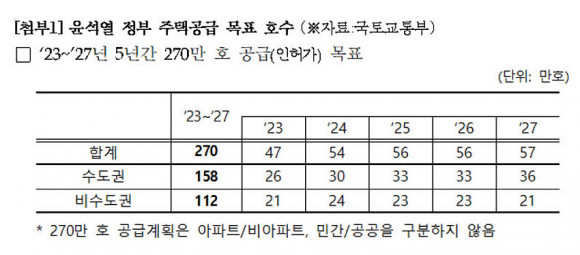 ±¹ÅäºÎ Á¦ÃâÀÚ·á¿¡ µû¸£¸é, À±¼®¿ Á¤ºÎÀÇ ÇâÈÄ 5³â°£ ÁÖÅðø±Þ ¸ñÇ¥´Â ÀÎÇã°¡ ±âÁØ 270¸¸ È£´Ù. 2023³â 47¸¸, 2024³â 54¸¸, 2025³â 56¸¸, 2026³â 56¸¸, 2027³â 57¸¸ È£ µî ¿¬°£ ¸ñÇ¥¸¦ ¼ö¸³Çß°í, ¸Å³â ¸ñÇ¥¸¦ Á¶±Ý¾¿ ³ô¿© Àâ°í ÀÖ´Ù.