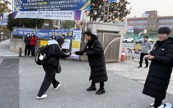 ¼±¼öµéÀº ¡®»ç³ÉÀÇ ½Ã°£Àº Áö±Ý, ¼ö´É ´ë¹Ú!¡¯ÀÌ ÀûÈù ÇÇÄϰú ÇÔ²² ÀÀ¿ø ±¸È£¸¦ ¿ÜÄ¡°í ¼öÇè»ýµé¿¡°Ô ÃÊÄݸ´ÀÌ ´ã±ä °£½Ä 800°³¸¦ ³ª´²ÁÖ¸ç ÈûÀ» º¸ÅÉ´Ù.