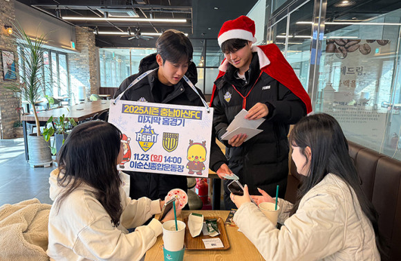 Ãæ³²¾Æ»êÇÁ·ÎÃ౸´Ü(ÀÌÇÏ Ãæ³²¾Æ»êFC)Àº Áö³ 20ÀÏ(¸ñ) 2025½ÃÁ𠸶Áö¸· Ȩ°æ±â¸¦ ¾ÕµÎ°í ¾Æ»ê½Ãû°ú ¾Æ»ê½Ã °ü³» ´ëÇÐ 3°÷(¼±¹®´ëÇб³, ¼øÃµÇâ´ëÇб³, È£¼´ëÇб³)À» ã¾Æ ÆÒµé°ú Á÷Á¢ ¸¸³ª´Â ±ô¦ °Ô¸±¶ó È«º¸ Ȱµ¿À» ÁøÇàÇß´Ù.