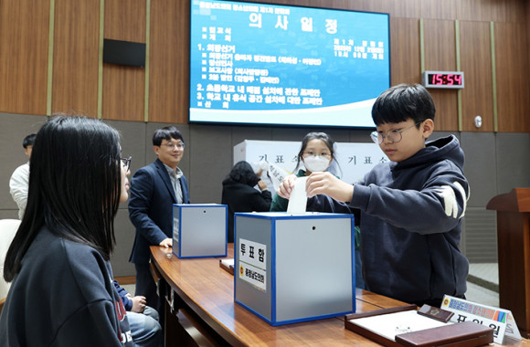 À̳¯ ÀÇȸ±³½Ç¿¡¼ È«¼º ³»Æ÷ÃʵîÇб³ ÇлýµéÀº ÀÇÀå ¼±°Å¿¡ Ã⸶ÇÑ È帵éÀÇ Á¤°ß ¹ßÇ¥¸¦ µè°í, Á÷Á¢ ÅõÇ¥ÇØ ÀÇÀåÀ» ¼±ÃâÇÏ´Â °úÁ¤À» üÇèÇϸç ÁֹδëÇ¥ÀÎ µµÀÇ¿øÀÇ ¿ªÇÒÀ» ÀÌÇØÇß´Ù.