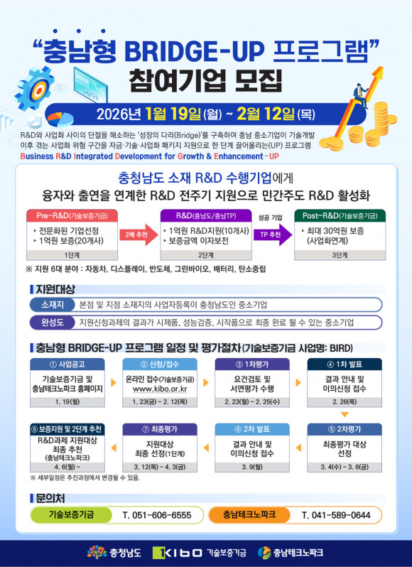 Ãæ³²µµ´Â ±â¼úº¸Áõ±â±Ý, Ãæ³²Å×Å©³ëÆÄÅ©¿Í ÇÔ²² ¼ÒºÎÀ塤Áß¼Ò±â¾÷ ¼ºÀå Áö¿øÀ» À§ÇÑ Ãæ³²Çü ±â¾÷ ¸ÂÃã Áö¿ø»ç¾÷(BRIDGE-UP ÇÁ·Î±×·¥)À» ÃßÁøÇÑ´Ù°í 14ÀÏ ¹àÇû´Ù.