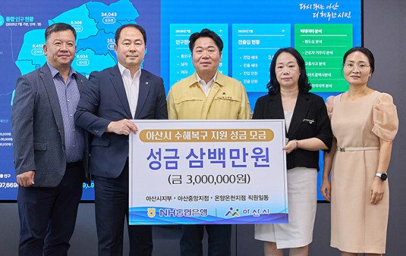 Áö³ 8ÀÏ ³óÇùÀºÇà ¾Æ»ê½ÃÁöºÎ(ÁöºÎÀå À̱ÔȲ), ¿Â¾ç¿ÂõÁöÁ¡(ÁöÁ¡Àå À±¼ÒÇö), ¾Æ»êÁß¾ÓÁöÁ¡(ÁöÁ¡Àå ¿À³²¼÷)ÀÌ ÁýÁßÈ£¿ì ÇÇÇØ Áö¿ª ÁֹεéÀ» µ½±â À§ÇØ ÀÓÁ÷¿øµéÀÌ ¸ð±ÝÇÑ ¼º±Ý 300¸¸ ¿øÀ» Àü´ÞÇß´Ù.