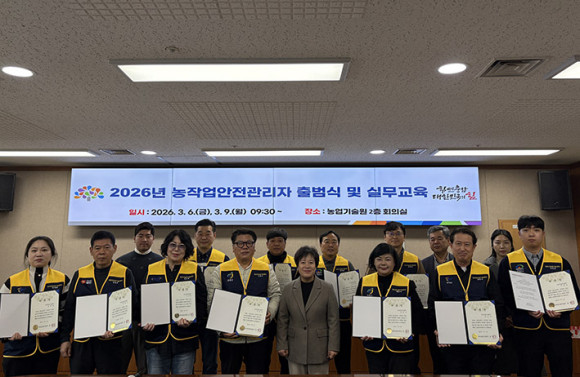 µµ ³ó¾÷±â¼ú¿øÀº 6ÀÏ ±â¼ú¿ø ȸÀǽǿ¡¼ õ¾È, ¾Æ»ê, ³í»ê, ±Ý»ê, ºÎ¿©, ÅÂ¾È 6°³ ½Ã±º¿¡¼ ¼±¹ßµÈ ¾ÈÀü°ü¸®ÀÚ 12¸í°ú °ü°èÀÚµéÀÌ Âü¼®ÇÑ °¡¿îµ¥ ¡®2026³â ³óÀÛ¾÷ ¾ÈÀü°ü¸®ÀÚ Ãâ¹ü½Ä¡¯À» °³ÃÖÇß´Ù.