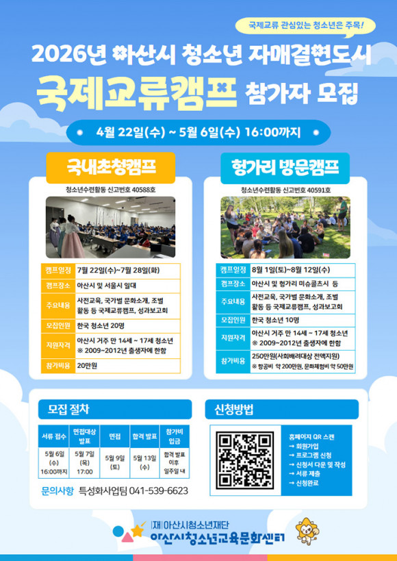 ¾Æ»ê½Ãû¼Ò³âÀç´Ü »êÇÏ ¾Æ»ê½Ãû¼Ò³â±³À°¹®È¼¾ÅÍ(°üÀå ¹èÁ¤¼ö)´Â 4¿ù 22ÀÏ(¼ö)ºÎÅÍ 5¿ù 6ÀÏ(¼ö) ¿ÀÈÄ 4½Ã±îÁö ¡®2026³â ¾Æ»ê½Ã û¼Ò³â ±¹Á¦±³·ùÄ·ÇÁ¡¯ »ó¹Ý±â Âü°¡ÀÚ¸¦ ¸ðÁýÇÑ´Ù°í ¹àÇû´Ù.