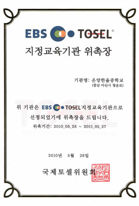 ¿Â¾çÇÑ¿ÃÁßÇб³(±³Àå ±è¼öÈï)°¡ Áö³ 5¿ù 28ÀÏ EBS TOSEL ÁöÁ¤±³À°±â°üÀ¸·Î À§Ã˵б¹Á¦Å伿À§¿øÈ¸·ÎºÎÅÍ À§ÃËÀåÀ» ¹Þ¾Ò´Ù. TOSELÀº ¡®Test of the Skills in the English Language¡¯ÀÇ ¾àĪÀ¸·Î ´ëÇÐÀÔÇÐ ¼öÇдɷ½ÃÇè ÃâÁ¦À§¿øÀ» ¿ªÀÓÇÑ ±³¼öµéÀÌ ¿ì¸®ÀÇ ½ÇÁ¤¿¡ ¸Âµµ·Ï °³¹ßÇÑ ½ÃÇèÀ¸·Î ¹®ÀÚ¾ð¾î(Àбâ´É·Â+¾²±â´É·Â) ¿Í À½¼º¾ð¾î(¸»Çϱâ´É·Â+µè±â´É·Â)ÀÇ ´É·ÂÀ» Æò°¡ÇÏ´Â ¿µ¾î´É·ÂÀÎÁõ½ÃÇèÁ¦µµ·Î EBS Çѱ¹±³À°¹æ¼Û°ø»ç°¡ ÁÖ°üÇÏ¿© ½Ç½ÃÇÑ´Ù. EBS´Â ÅäÀÍ(TOEIC), ÅäÇÃ(TOEFL) µî ¿Ü±¹»ê ¿µ¾î´É·Â½ÃÇèÀ¸·Î ÀÎÇÑ ¿ÜÈÀ¯ÃâÀ» ÁÙÀÌ°í ±âÇüÀûÀ¸·Î È®´ëµÈ ¿µ¾î »ç±³À° ½ÃÀåÀ» Á¤»óÈÇϱâ À§ÇØ ±¹³»¿¡¼ °³¹ßµÈ ÅäÁ¾¿µ¾î´É·Â½ÃÇèÀÎ TOSELÀ» ÁÖ°üÇØ ¿À°í ÀÖ´Ù. ¿Â¾çÇÑ¿ÃÁßÀÌ EBS TOSEL ÁöÁ¤±³À°±â°üÀ¸·Î À§Ã˵ʿ¡ µû¶ó ¿Â¾çÇÑ¿ÃÁß Àü±³»ýÀº ¿µ¾î´É·ÂÀ» Å×½ºÆ®ÇØ º¼ ¼ö ÀÖ´Â ±âȸ¸¦ °®°Ô µÆ´Ù.