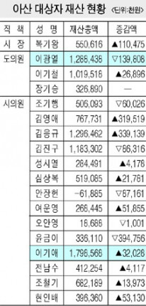 ¾Æ»ê½ÃÀÇ¿ø Áß Àç·Â°¡(?)´Â À̱â¾Ö ÀÇ¿øÀ¸·Î ³ªÅ¸³µ´Ù. ÀÌ ÀÇ¿øÀº 17¾ï9õ856¸¸8õÀ¸·Î Àü³âº¸´Ù 3õ202¸¸8õ¿ø Áõ°¡Çß´Ù°í ½Å°íÇß´Ù. ÀÌ¾î ±èÀÀ±Ô ÀÇ¿øÀÌ 12¾ï9õ646¸¸2õ¿ø(3¾ï3õ913¸¸9õ¿ø Áõ°¡), ±èÁø±¸ ÀÇ¿øÀÌ 11¾ï8õ330¸¸2õ¿ø(8õ631¸¸6õ¿ø °¨¼Ò)À¸·Î ½Å°íÇØ 2, 3À§¸¦ ±â·ÏÇß´Ù.