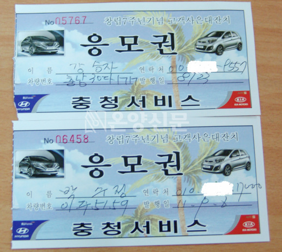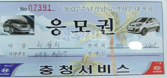 Áö³ 1Â÷ Çà»ç´Â Áö³ÇØ 4¿ùºÎÅÍ 8¿ù 13ÀϱîÁö ÃæÃ»¼ºñ½º¸¦ ÀÌ¿ëÇÑ ¸ðµç °í°´µé¿¡(A/S Á¦¿Ü)ÀÀ¸ð±ÇÀ» ¹èºÎÇØ ¸ð´×½Â¿ëÂ÷ 1´ë, ÇØ¿Ü¿©Çà»óǰ±Ç 6¸Å(3¸í), ¿£Áø¿ÀÀϱ³È¯±Ç 50¸íÀ» Ãß÷ÇÏ¿© Á¦°øÇß´Ù.