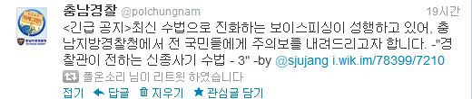 ÀÌ¿¡ Ãæ³²Áö¹æ°æÂûû¿¡¼´Â °ø½Ä Æ®À§ÅÍ °èÁ¤À»(@polchungnam) ÅëÇØ ¡°°æÂû°üÀÌ ÀüÇÏ´Â µÎ °¡Áö ½ÅÁ¾»ç±â ¼ö¹ý¡±ÀÇ ³»¿ëÀ¸·Î ù ¡®º¸À̽ºÇÇ½Ì °æº¸Á¦¡¯ ¹ß·ÉÀ» ³»·È´Ù.