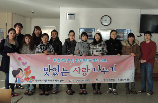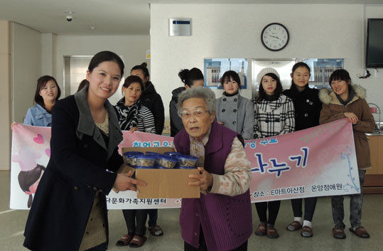 ¾Æ»ê¿¡ °ÅÁÖÇÏ´Â ´Ù¹®È ÀÌÁÖ¿©¼ºµéÀÌ e¸¶Æ® ¾Æ»êÁ¡(Á¡Àå À̺´ÁÖ)¿¡¼ 12ÁÖ°£ ½Ç½ÃÇÑ ÇѽÄÁ¶¸®»ç°úÁ¤À» ¼ö·á ÈÄ ¿ì¸® °íÀ¯ À½½ÄÁß ÇϳªÀÎ ¹ö¼¸¾ßäÀüÀ» Á÷Á¢ ¸¸µé¾î Á¤¾Ö¿ø¿¡ °ÅÁÖÇÏ´Â ¾î¸£½Åµé¿¡°Ô ¹æ¹®ÇØ Àü´ÞÇß´Ù.