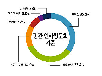 °°Àº Ç¥º»À» ´ë»óÀ¸·Î Àλçû¹®È¸ Æò°¡ ±âÁØÀ» ¹°Àº °á°ú 35.1%°¡ ¡®µµ´ö¼º¡¯À» ¼Õ²Å¾Ò´Ù. ÀÌ¾î ±Ù¼ÒÇÑ Â÷ÀÌÀÎ 33.4%°¡ ¡®½Ç¹«´É·Â¡¯À» Áö¸ñÇß´Ù. ÈļøÀ§·Î´Â 14.9%°¡ ¡®¿¬·û°ú °æÇ衯, 7.8%°¡ ¡®±¹°¡°ü¡¯, 3.0%°¡ ¡®Áö½Ä°ú Çз¡¯À̶ó°í ´äÇß´Ù. ¡®Àß ¸ð¸§¡¯Àº 5.8%¿´´Ù.