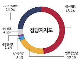 ÇÑÆí Á¤´çÁöÁöµµ´Â »õ´©¸®´çÀÌ 48.4%·Î Á÷Àü Á¶»ç(2¿ù 27ÀÏ)¿Í ºñ±³ÇØ 5.5% Æ÷ÀÎÆ® »ó½ÂÇß´Ù. ¹ÎÁÖÅëÇÕ´çÀº 19.1%·Î Á÷Àü Á¶»ç ´ëºñ 8.9% Æ÷ÀÎÆ® Å©°Ô Ç϶ôÇß´Ù. Áøº¸Á¤ÀÇ´çÀº 3.1%(1.4%p¡ã), ÅëÇÕÁøº¸´çÀº 1.2%(0.2%p¡å), ±âŸÁ¤´ç 4.2%(0.6%p¡ã), ¹«´çÃþÀº 24.0%(1.6%p¡ã) µîÀ̾ú´Ù.