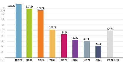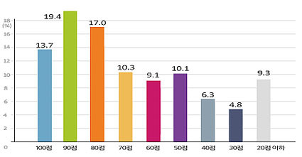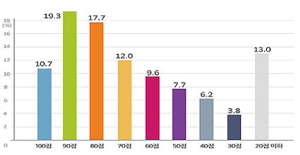 Á¡¼öº°·Î´Â 90Á¡(19.3%)¡µ80Á¡(17.7%)¡µ20Á¡ ÀÌÇÏ(13.0)¡µ70Á¡(12.0%)¡µ100Á¡(10.7%)¡µ60Á¡(9.6%)¡µ50Á¡(7.7%)¡µ40Á¡(6.2%)¡µ30Á¡(3.8%) ¼øÀ̾ú´Ù. °íÁ¡ Æò°¡´Â 47.7%, Áß°£Á¡ Æò°¡´Â 29.3%, ÀúÁ¡ Æò°¡´Â 23.0%ÀÇ ÀÀ´ä·üÀ» º¸¿´´Ù.