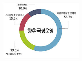 ÀÀ´äÀÚµéÀº ¶Ç °ú¹Ý¼öÀÎ 55.7%°¡ ¹Ú±ÙÇý ´ëÅë·ÉÀÌ ÇâÈÄ ±¹Á¤¿î¿µÀ» ¡®Áö±Ýº¸´Ù Àß ÇÒ °Í¡¯À̶ó°í ±â´ëÇß´Ù. ¡®Áö±Ý Á¤µµ ÇÒ °Í¡¯Àº 19.1%, ¡®Áö±Ýº¸´Ù ¸øÇÒ °Í¡¯Àº 15.2%ÀÇ ÀÀ´ä·üÀ» º¸¿´´Ù. ¡®Àß ¸ð¸§¡¯Àº 10.0%¿´´Ù.