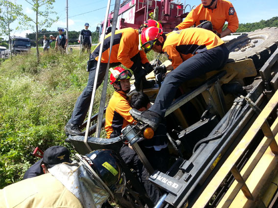 ÀÌ¿¡ ¾Æ»ê¼Ò¹æ¼ ±¸Á¶´ë¿øÀº ½Å¼ÓÇϰí Ä§ÂøÇÏ°Ô Â÷·® ÅëÁ¦ ¹× ÀÛ¾÷°ø°£ È®º¸ ÈÄ ±¸Á¶°øÀÛÂ÷ Å©·¹ÀÎÀ» ÀÌ¿ëÇØ Áö°ÔÂ÷ Çìµå°¡µå¿¡ °ßÀιٸ¦ °É°í µé¾î¿Ã¸° ÈÄ ¿¡¾î¹éÀ» Æì¼ ¿ä±¸Á¶ÀÚ¿¡°Ô ¾ÈÀüº§Æ® Âø¿ë ÈÄ ¼öÁ÷À¸·Î µé¾î¿Ã·Á Áö»óÀ¸·Î ¾ÈÀüÇÏ°Ô ±¸Á¶Çß´Ù.