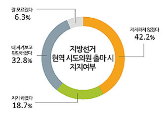 °ÅÁÖ Áö¿ª ½Ã¡¤µµÀÇ¿øÀÇ ³»³â Áö¹æ¼±°Å ÀçÃ⸶½Ã ÁöÁö¿©ºÎ´Â Àüü Æò±Õ 42.2%°¡ ¡®ÁöÁöÇÏÁö ¾ÊÀ½¡¯, 32.8%°¡ ¡®´õ ÁöÄѺ¸°í ÆÇ´Ü¡¯, 18.7%°¡ ¡®ÁöÁöÇÔ¡¯À̶ó°í ¹àÇû´Ù. ¡®Àß ¸ð¸§¡¯Àº 6.3%¿´´Ù.