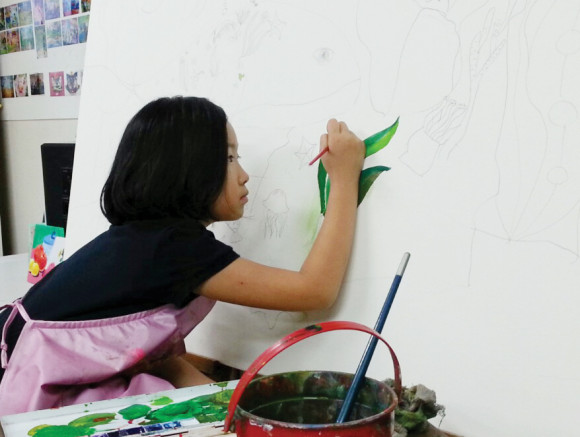 ÃʵîÇлý 1ÇгâÀ¸·Î¼ ¹ö°Å¿ï¹ýÇÑ »çÀÌÁîÀÎ 50È£ ĵ¹ö½º¸¦ ÀڽŸ¸ÀÇ ¼¼°è·Î ä¿ì°í, »ç¿ëÇÏ´Â Àç·áµéÀº ¾ÆÅ©¸±¹°°¨, ¸¶Ä«, ÇÑÁö, »ö¿¬ÇÊ, »çÀÎÆæ, ¸ÞÅ»Ææ, ºñÁî µîµî ´Ù¾çÇÏ´Ù. »ö°¨À» Ç¥ÇöÇÏ´Â ºÎºÐ ¶ÇÇÑ Å¹¿ùÇØ, ¼ÀºÀÌ¿¡°Ô¡®»öÄ¥ÇÒ ¶§ ¹«½¼ »öÀ¸·Î ÇÒÁö °í¹ÎÇϰí ÇØ¿ä?¡¯¶ó°í ¹¯ÀÚ. ¹æ±ß ¿ôÀ¸¸ç ¡°±×³É Ä¥ÇØ¿ä. °í¹Î ¾È ÇØ¿ä.¡±¶ó°í ¸»ÇÑ´Ù.